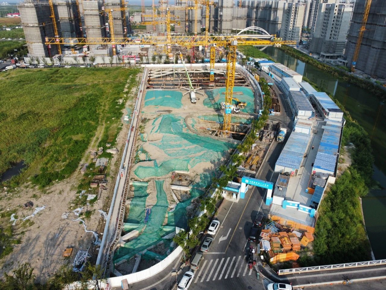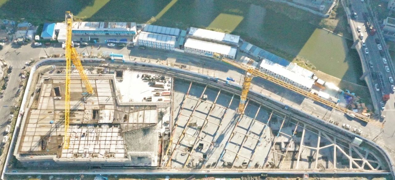 項目應(yīng)用“先撐后拆”施工方法,通過“開挖一段土方、施工一段基礎(chǔ)拆除一段圍護(hù)”的方式,在狹小空間里“靈活作戰(zhàn)”應(yīng)用“鉆孔灌注樁+高壓旋噴樁”減小機械占用空間,以抬高正負(fù)零標(biāo)高0.5米的方式,使基坑與周邊場地持平,避免雨季內(nèi)澇隱患,保障項目如期封頂。