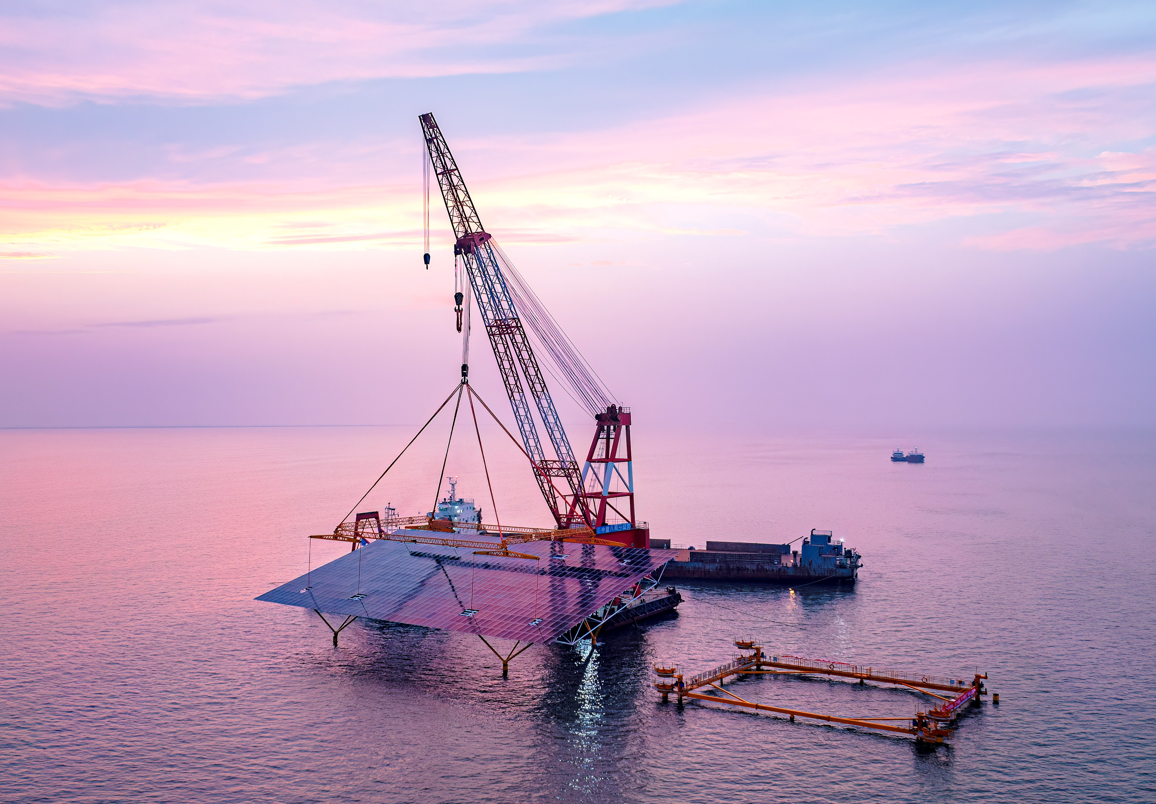 針對施工區域水位差異,項目采用差異化吊裝技術:深水區用大型起重船和專用吊具完成平臺吊裝,淺水區則研發 “浮托法” 運輸及安裝技術,實現風浪中毫米級精準對接。項目累計吊裝超 7000 次,吊裝鋼結構總量約 7.7 萬噸,高峰時期百余艘船只往來穿梭,4 個碼頭、3 個作業面同步施工,單套平臺安裝時間縮短至 56 分鐘,可實現每天 8 套平臺落戶大海。