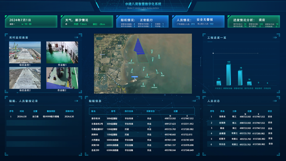 為保障海上施工安全,項目打造海上光伏施工智能監管平臺,整合天氣、環境、人員、船機、物料等信息,實現作業船只航跡監控調度、物料及關鍵工序進度監管等功能,達成管理可視化。同時,項目研發智能潮位監測系統和智能風浪預測系統,結合實時監測與歷史規律分析實現高精度趨勢預測,全面應用無人機和無人船巡檢,構建 “天 - 空 - 海 - 地” 全域施工監控。此外,項目還研發自動脫鉤緩降分配吊架以規避高空解鉤風險,為夜間趕潮施工人員配備安全肩燈,守護作業安全。